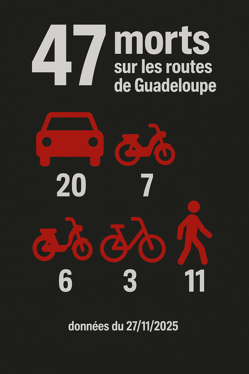 - Accidents fréquents : la Guadeloupe enregistre chaque année plusieurs centaines d’accidents de la route, dont une part importante impliquant des deux-roues et des piétons.